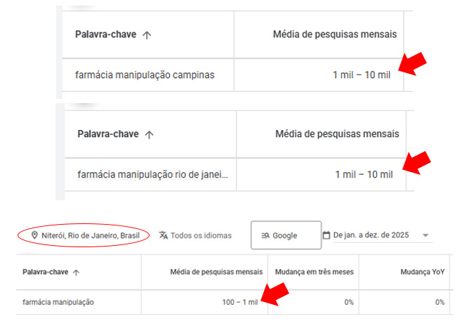 No exemplo abaixo, foram realizadas três análises utilizando a ferramenta Planejador de Palavras-chave do Google, considerando diferentes cidades: