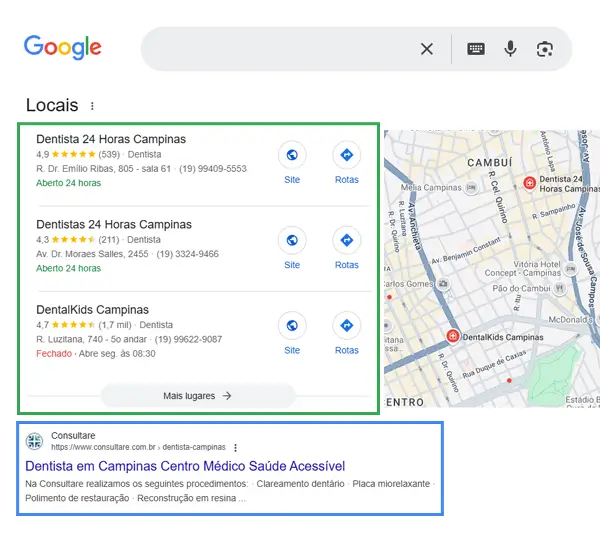Quando alguém pesquisa no Google com uma intenção local, como “dentista em Campinas”, a sua clínica pode aparecer em 2 LUGARES: